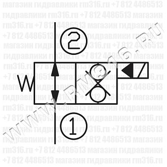При снятом напряжении гидроклапан пропускает поток из (1) в (2) и из (2) в (1). При подаче напряжения на электромагнитную катушку гидроклапан блокирует поток из (1) в (2) и из (2) в (1).