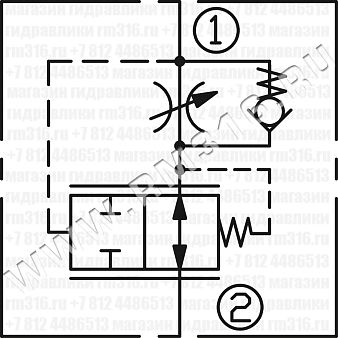 Гидроклапан LFR10-2A поддерживает постоянный расход от порта (1) к порту (2) независимо от изменения давления нагрузки. Обратный поток возвращается через регулирующее отверстие и не компенсируется.