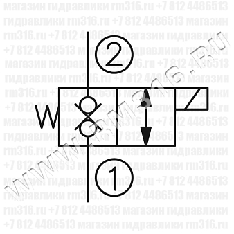 При снятом напряжении MSV-08-28 блокирует поток из (1) в (2) и из (2) в (1). При подаче напряжения на электромагнитную катушку гидроклапан пропускает поток из (1) в (2) и из (2) в (1).