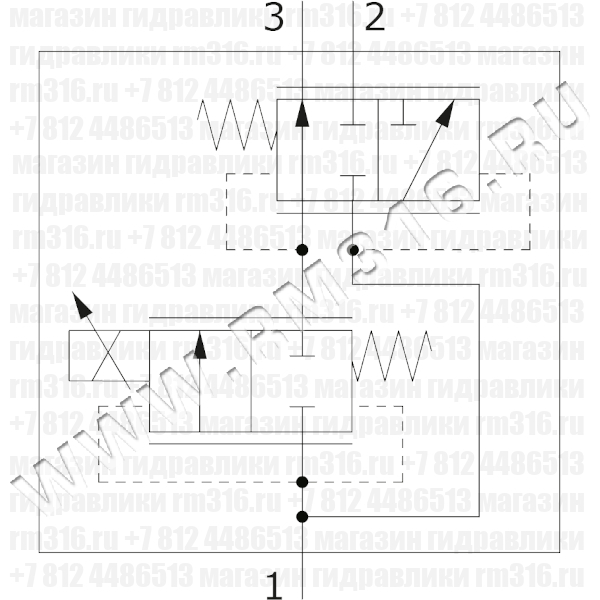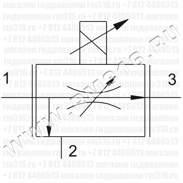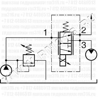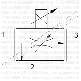 Трехлинейные регуляторы расхода (регуляторы потока) с электро-пропорциональным управлением PP12X используются для изменения и поддержания потока рабочей жидкости постоянным. Такие гидравлические регуляторы обладают высокой точностью настройки и обеспечивают компенсацию по давлению. Компенсация по давлению означает, что поток жидкости, проходящий через регулятор расхода, не зависит от давления и вязкости масла. Лишний поток (линия 2) можно вывести на слив в маслобак или же направить на второго потребителя. Гидроклапан PP12X может быть использован в качестве 2-х линейного регулятора расхода, если заблокировать отверстие байпасной линии (2).ГИДРАВЛИЧЕСКАЯ СХЕМА