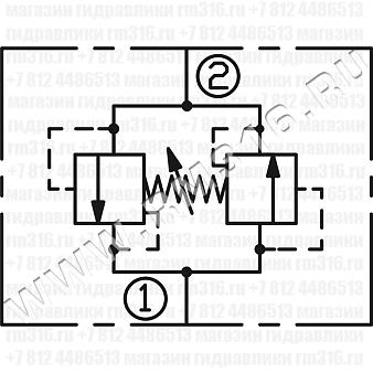 LBRV-10 блокирует поток из порта 1 в порт 2 и из порта 2 в 1 до тех пор, пока не появится давление, достаточное для открытия клапана за счет преодоления заданного усилия пружины. Когда давление в любом из каналов становится выше давления настройки, поток направляется в противоположную линию.