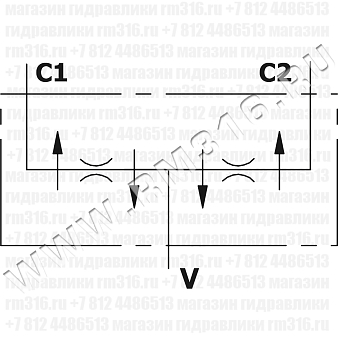 Подключите порт V к линии нагнетания, а порты C1 и C2 к гидроприводу. Гидравлическая жидкость поступает из линии V и делится на две равные части в линиях C1 и C2. В обратную сторону поток суммируется.