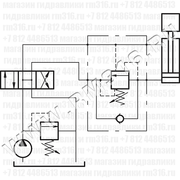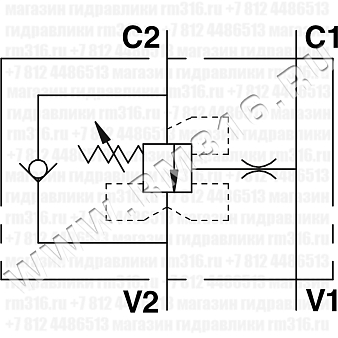 Подключите V2 к линии нагнетания, С2 – к гидроцилиндру (контролируемому порту), порты V1 - C1 к линии управления (линия с пилотным сигналом). Настройка тормозного (контрбалансного, уравновешивающего) клапана должна быть в 1,3 раза больше, чем максимальное рабочее давление, действующее в системе.