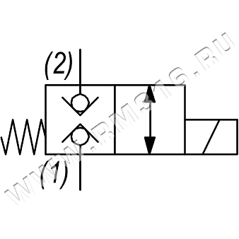 При снятом напряжении DTAFXCN блокирует поток из (1) в (2) и из (2) в (1). При подаче напряжения на электромагнитную катушку гидроклапан пропускает поток из (1) в (2) и из (2) в (1).