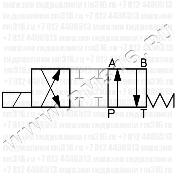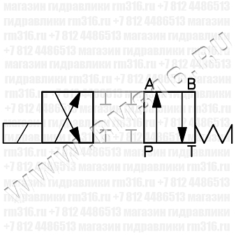 | Исполнение: | Двухпозиционный четырехлинейный (на гидросхеме показаны соединения каналов в промежуточном положении золотника) |