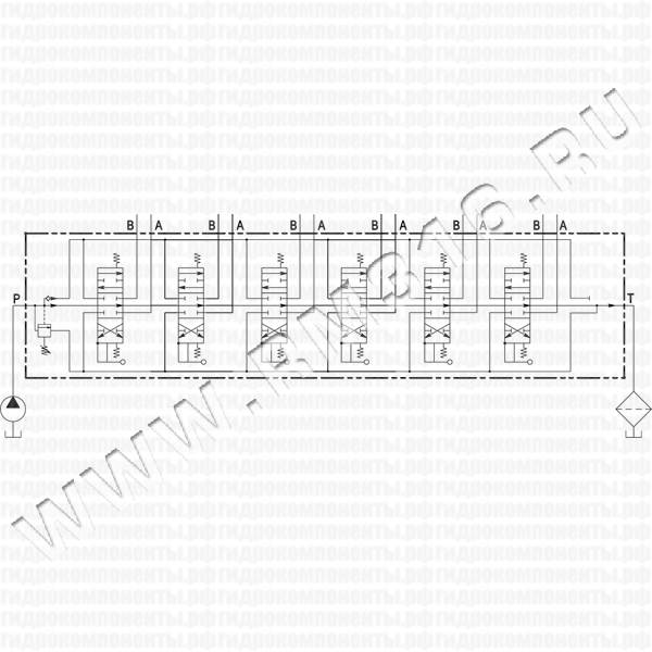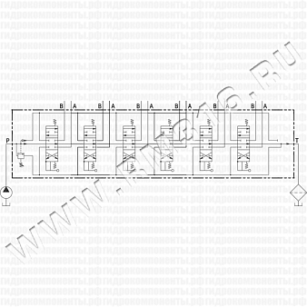 Функциональная гидравлическая схема гидрораспределителя с шестью золотниками типа 103: