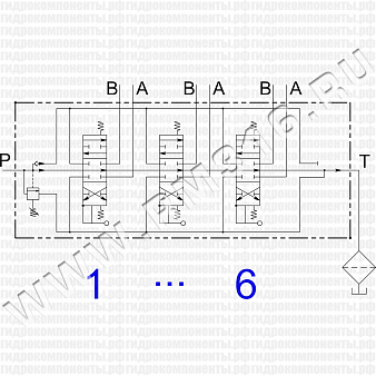 Функциональная гидравлическая схема гидрораспределителя с шестью золотниками типа А: