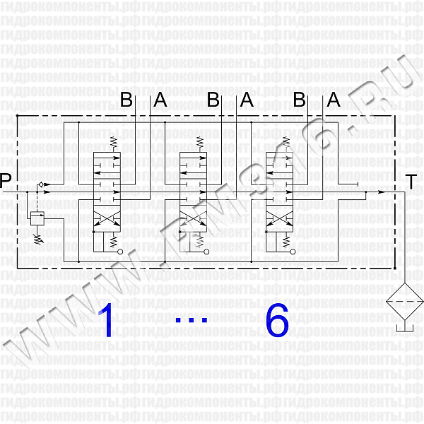 Функциональная гидравлическая схема гидрораспределителя с шестью золотниками типа А: