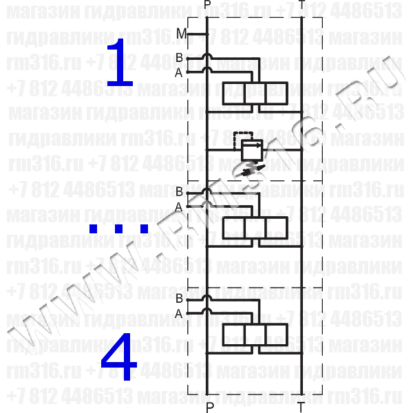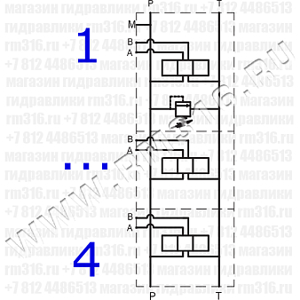А, B - 1/2" BSP P, T - 3/4" BSP M - 1/4" BSP (установлена заглушка, М - порт под манометр) |