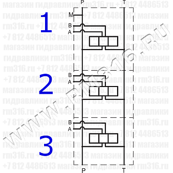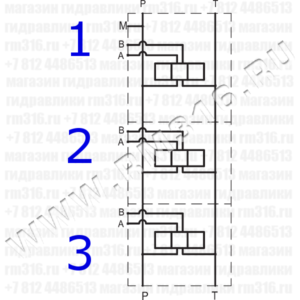 А, B - 1/2" BSP P, T - 3/4" BSP M - 1/4" BSP (установлена заглушка, М - порт под манометр) |