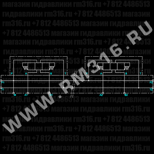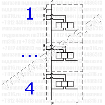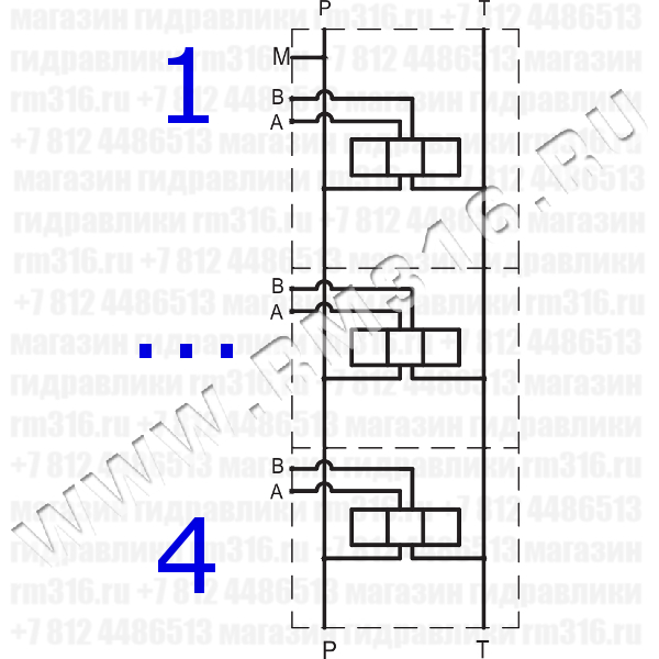 А, B - 1/2" BSP P, T - 3/4" BSP M - 1/4" BSP (установлена заглушка, М - порт под манометр) |