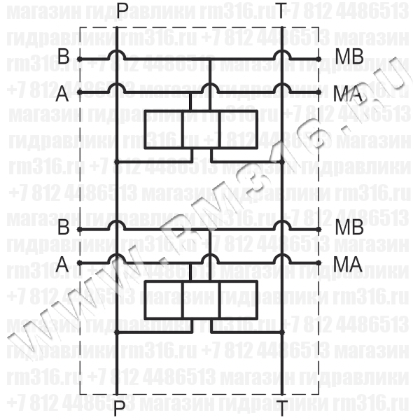 А, B - 3/4" BSP P - 3/4" BSP T - 1" BSP MA, MB - 1/4" BSP (МA, MB - порты под манометры, не заглушены) |