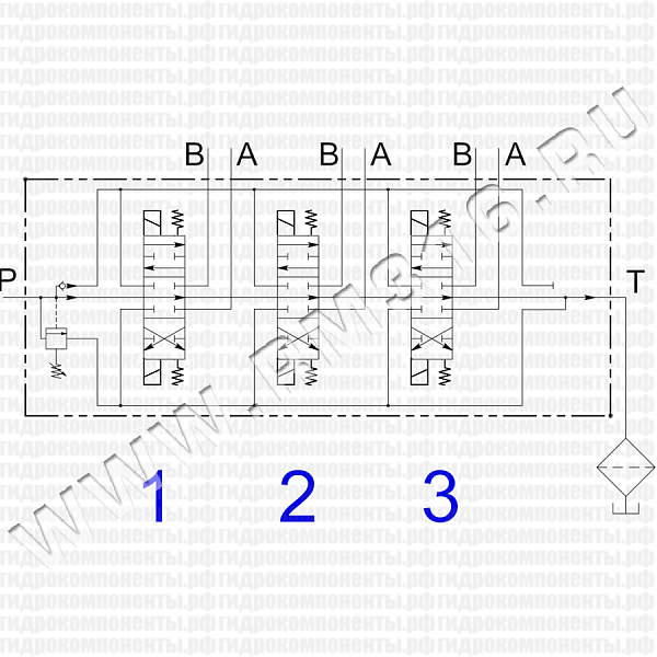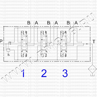 Функциональная гидравлическая схема гидрораспределителя с тремя золотниками типа А: