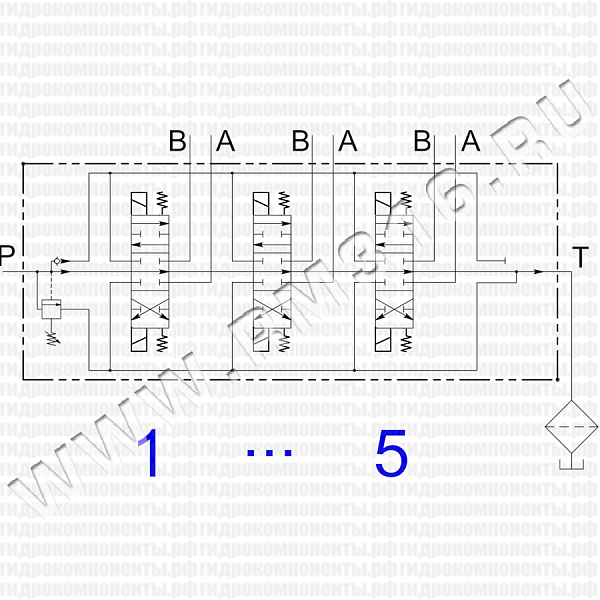 Функциональная гидравлическая схема гидрораспределителя с пятью золотниками типа А: