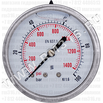 - Градуировка шкалы: 0...100 бар, 0...1400 psi- Корпус из нержавеющей стали AISI 304