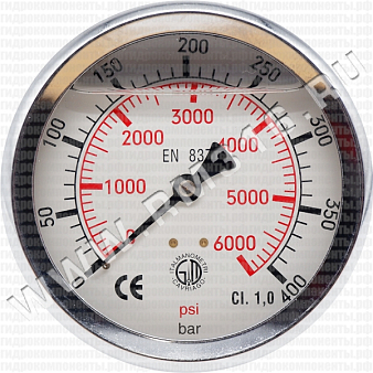 - Градуировка шкалы: 0...400 бар, 0...6000 psi- Корпус из нержавеющей стали