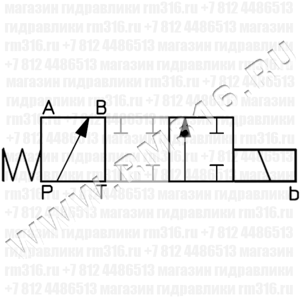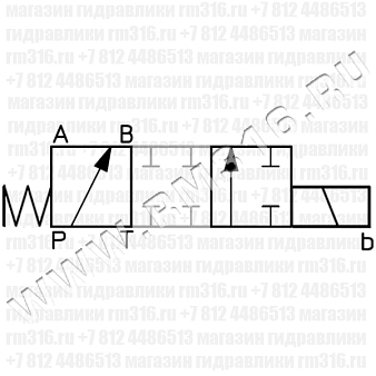 | Исполнение: | Двухпозиционный четырехлинейный (на гидросхеме показаны соединения каналов в промежуточном положении золотника) |