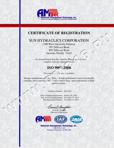 Вы можете скачать сертификат качества SUN HYDRAULICS ISO 9001:2008 по ссылке.