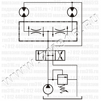 Подключите порт V к линии нагнетания, а порты C1 и C2 к гидроприводу. Гидравлическая жидкость поступает из линии V и делится на две равные части в линиях C1 и C2. В обратную сторону поток суммируется.
