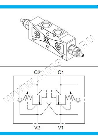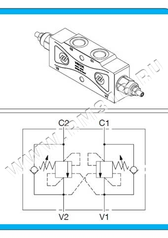 Входной поток проходит из V1 в C1, влияя при этом на линию от С2 к V2, что обеспечивает плавность движения гидроцилиндра. Если входной поток подается в порт V2, ситуация будет обратной. Давление настройки тормозного клапана должно быть на 30% больше макс. давления нагрузки в системе.