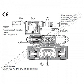 • -AE, AES - как -А плюс аналоговая (АЕ) или цифровая (AES) встроенная электроника (4). 4-х линейный золотник (2) перемещается в 5-и камерном корпусе (1) и управляется по цепи без обратной связи пропорциональным редукционным клапаном (3) типа DHRZO.