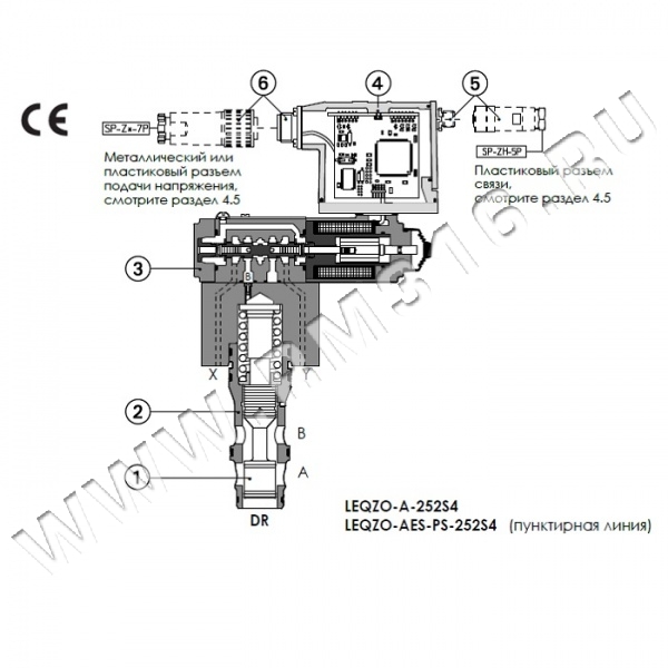 • -PS, последовательный интерфейс связи RS232. Опорный сигнал на клапан обеспечивается аналоговыми командами, направляемыми на разъем с 7 (или 12) штырями (6).