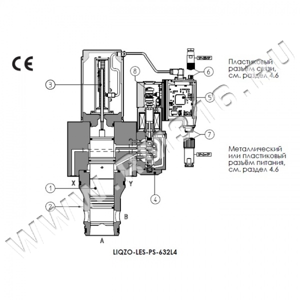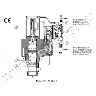 • -PS, последовательный интерфейс связи RS232. Опорный сигнал на распределитель обеспечивается аналоговыми командами, направляемыми на разъём с 7 (или 12) контактами (7).