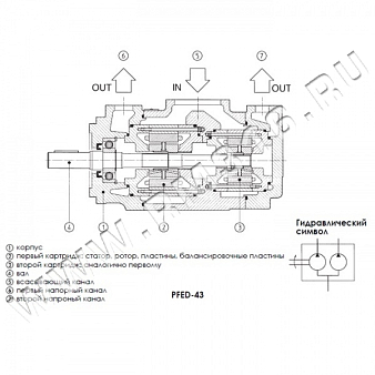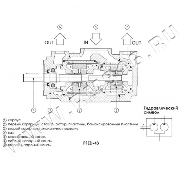 PFED (Atos, Италия) - сдвоенные пластинчатые насосы (2)(3), состоящие из двух картриджей типа PFE (см. табл. А005), компонованные в одном корпусе, с одним всасывающим (5) и двумя напорными каналами (6)(7).