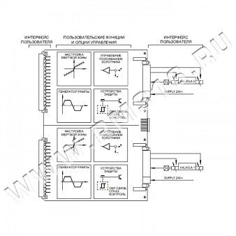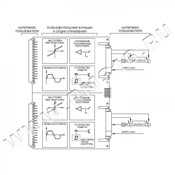 Усилитель управляет положением золотника пропорционально входному напряжению сигнала управления, обеспечивая подачу требуемого тока питания на электромагниты.