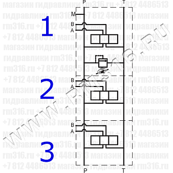 А, B - 1/2" BSP P, T - 3/4" BSP M - 1/4" BSP (установлена заглушка, М - порт под манометр) |