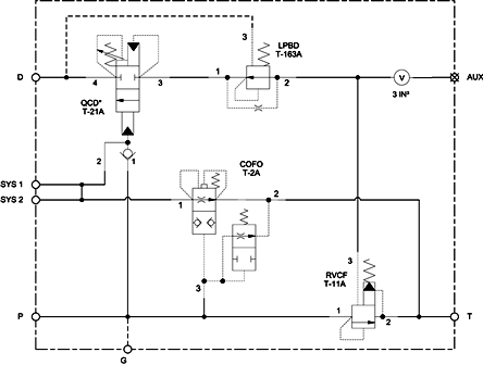 Блок клапанов Sun Hydraulics данной серии предназначен для зарядки гидроаккумулятора с помощью насоса с постоянным расходом. Когда давление достигает настройки клапана, насос разгружается. При падении давления до значения, определяемого фиксированным пилотным соотношением, насос снова включается для зарядки гидроаккумулятора. Вентилируемый предохранительный клапан служит для разгрузки насоса в качестве главной ступени, а также для сброса избыточного давления в системе. Данный блок клапанов имеет две дополнительных функции: простой контур, делающий разгрузку насоса более плавной, а также контур, обеспечивающий обратную связь по давлению в гидроаккумуляторе.